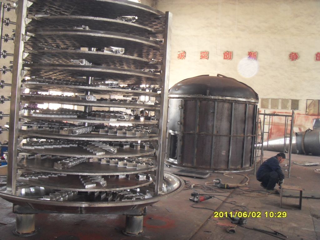 濕物料自加料器連續(xù)地加到干燥器上部干燥盤上,帶有耙葉的耙臂作回轉(zhuǎn)運(yùn)動(dòng)使耙臂作回轉(zhuǎn)運(yùn)動(dòng)使耙葉連續(xù)地翻抄物料。物料沿指數(shù)螺旋線流過(guò)干燥盤表面,在小干燥盤上的物料被移送到外緣,并在外緣落到下方的大干燥盤外緣,在大干盤上物料向里移動(dòng)并從中間落料口落如下一層小干燥盤中。大小干燥盤上下交替排列,物料得以連續(xù)地流過(guò)整個(gè)干燥器。中空的干燥盤內(nèi)通入加熱介質(zhì),加熱介質(zhì)形式有飽和蒸汽、熱水和導(dǎo)熱油,加熱介質(zhì)由干燥盤的一端進(jìn)入,從另一端導(dǎo)出。已干物料從后一層干燥盤落到殼體的底層,后被耙葉移送到出料口排出。濕份從物料中逸出,由設(shè)在頂蓋上的排濕口排出,真空型盤式干燥器的濕氣由設(shè)在頂蓋上的真空泵口排出。從底層排出的干物料可直接包裝。通過(guò)配加翅片加熱器、溶劑回收冷凝器、袋式除塵器、干料返混機(jī)構(gòu)、引風(fēng)機(jī)等輔機(jī),可提高其干燥的生產(chǎn)能力,干燥膏糊狀和熱敏性物 料,可方便地回收溶劑,并能進(jìn)行熱解和反應(yīng)操作。
