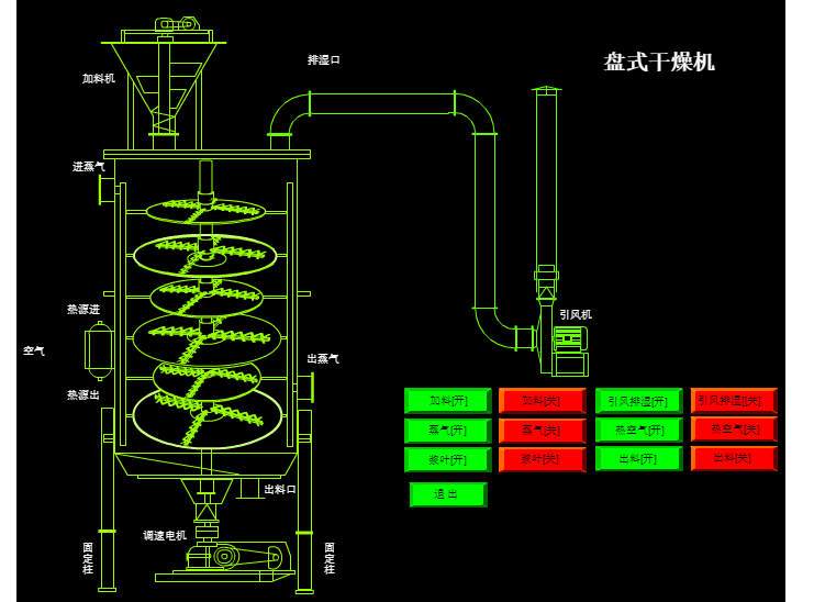 濕物料自加料器連續(xù)地加到干燥器上部干燥盤上,帶有耙葉的耙臂作回轉(zhuǎn)運(yùn)動(dòng)使耙臂作回轉(zhuǎn)運(yùn)動(dòng)使耙葉連續(xù)地翻抄物料。物料沿指數(shù)螺旋線流過干燥盤表面,在小干燥盤上的物料被移送到外緣,并在外緣落到下方的大干燥盤外緣,在大干盤上物料向里移動(dòng)并從中間落料口落如下一層小干燥盤中。大小干燥盤上下交替排列,物料得以連續(xù)地流過整個(gè)干燥器。中空的干燥盤內(nèi)通入加熱介質(zhì),加熱介質(zhì)形式有飽和蒸汽、熱水和導(dǎo)熱油,加熱介質(zhì)由干燥盤的一端進(jìn)入,從另一端導(dǎo)出。已干物料從后一層干燥盤落到殼體的底層,后被耙葉移送到出料口排出。濕份從物料中逸出,由設(shè)在頂蓋上的排濕口排出,真空型盤式干燥器的濕氣由設(shè)在頂蓋上的真空泵口排出。從底層排出的干物料可直接包裝。通過配加翅片加熱器、溶劑回收冷凝器、袋式除塵器、干料返混機(jī)構(gòu)、引風(fēng)機(jī)等輔機(jī),可提高其干燥的生產(chǎn)能力,干燥膏糊狀和熱敏性物 料,可方便地回收溶劑,并能進(jìn)行熱解和反應(yīng)操作。